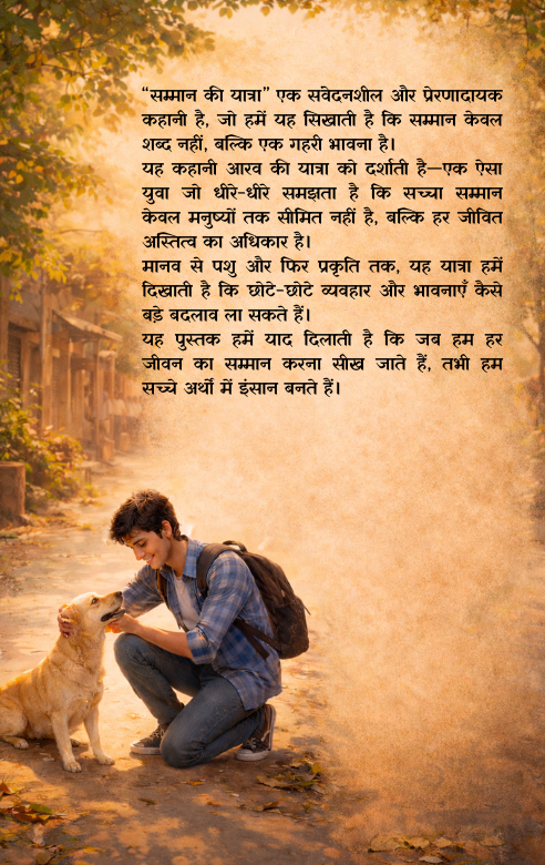 “सम्मान की यात्रा” एक संवेदनशील और प्रेरणादायक कहानी है, जो हमें यह सिखाती है कि सम्मान केवल शब्द नहीं, बल्कि एक गहरी भावना है। यह कहानी आरव की यात्रा को दर्शाती है—एक ऐसा युवा जो धीरे-धीरे समझता है कि सच्चा सम्मान केवल मनुष्यों तक सीमित नहीं है, बल्कि हर जीवित अस्तित्व का अधिकार है। मानव से पशु और फिर प्रकृति तक, यह यात्रा हमें दिखाती है कि छोटे-छोटे व्यवहार और भावनाएँ कैसे बड़े बदलाव ला सकते हैं। यह पुस्तक हमें याद दिलाती है कि जब हम हर जीवन का सम्मान करना सीख जाते हैं, तभी हम सच्चे अर्थों में इंसान बनते हैं।