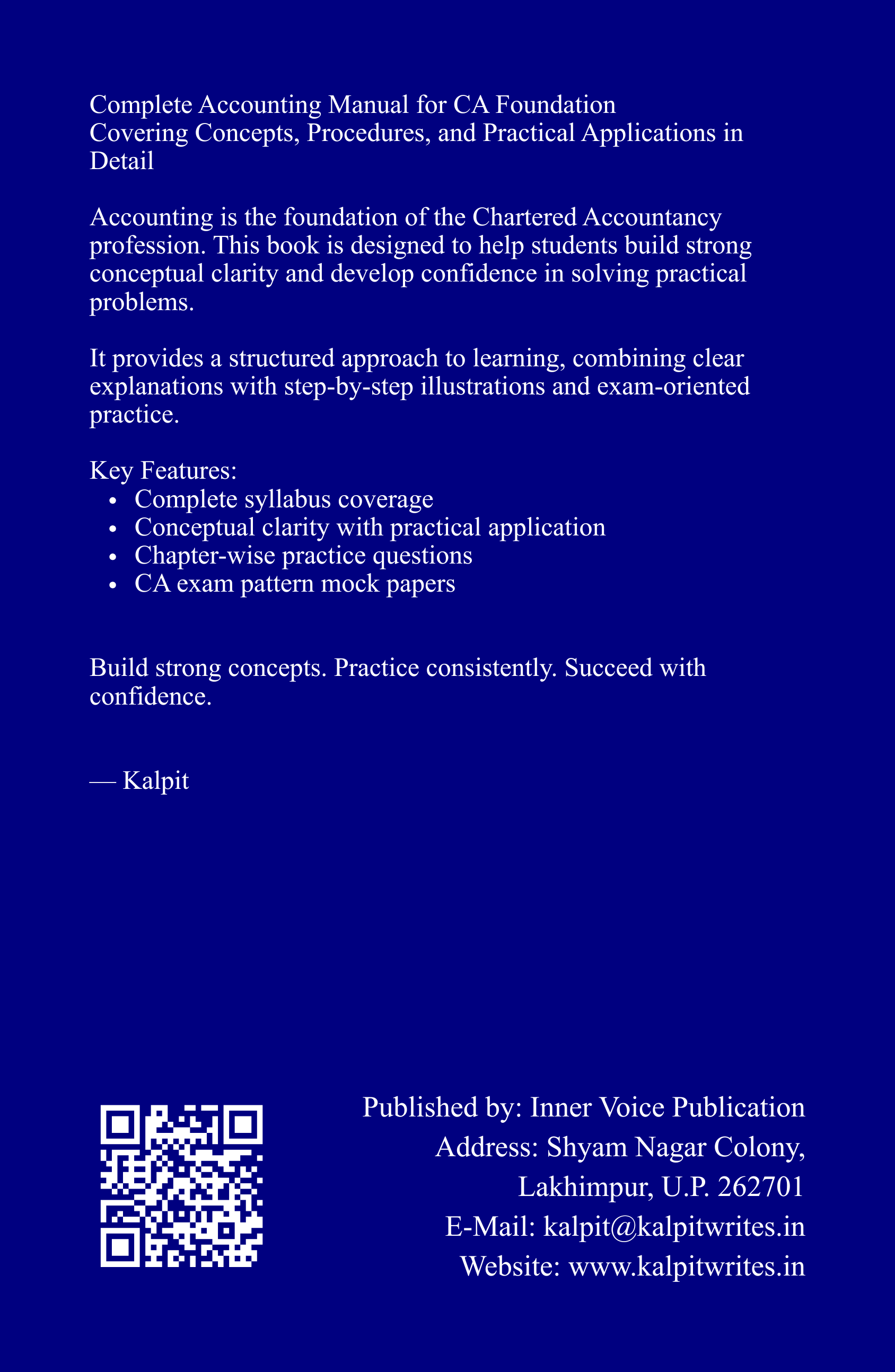 **Complete Accounting Manual for CA Foundation** *Covering Concepts, Procedures, and Practical Applications in Detail* This book is a comprehensive and structured guide designed specifically for CA Foundation students. It focuses on building strong conceptual clarity while ensuring practical application of accounting principles in an exam-oriented manner. The content is arranged chapter-wise, following a logical progression from basic concepts to advanced topics. Each chapter explains the underlying principles clearly and supports them with step-by-step illustrations to help students understand and apply accounting procedures effectively. The book includes extensive practice questions and mock papers based on the actual CA examination pattern, enabling students to test their understanding and improve performance. **Key Highlights:** * Complete coverage of CA Foundation Accounting syllabus * Clear explanation of concepts and procedures * Practical illustrations for better understanding * Chapter-wise question bank for practice * Mock papers based on ICAI exam pattern This manual serves as a reliable companion for students aiming to develop a strong foundation in accounting and approach their examinations with confidence.